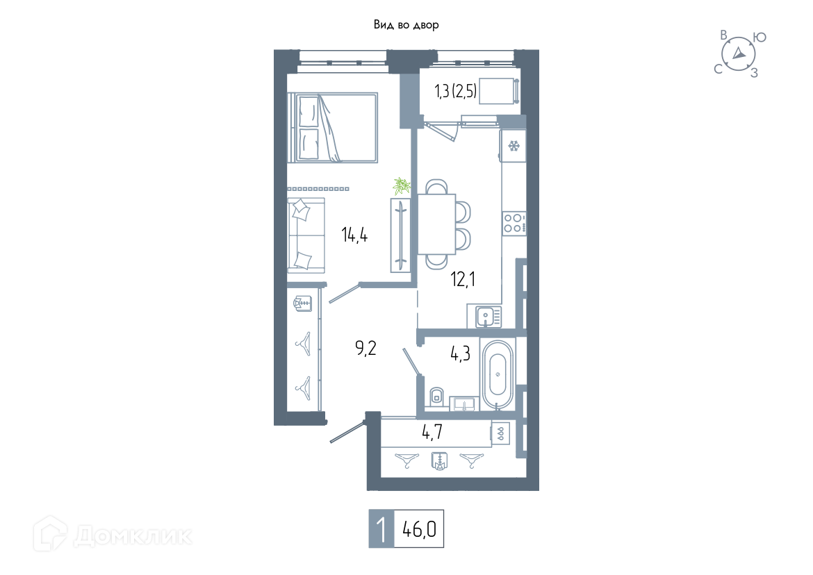 - Общая площадь: 46 м²