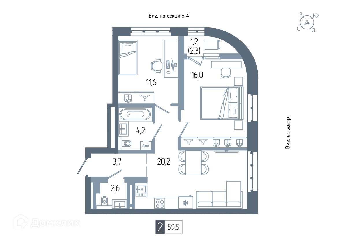 - Общая площадь: 59.5 м²