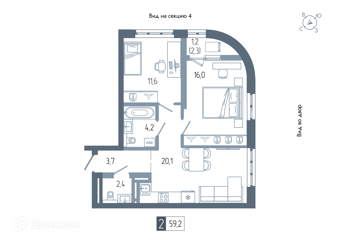 - Общая площадь: 59.2 м²