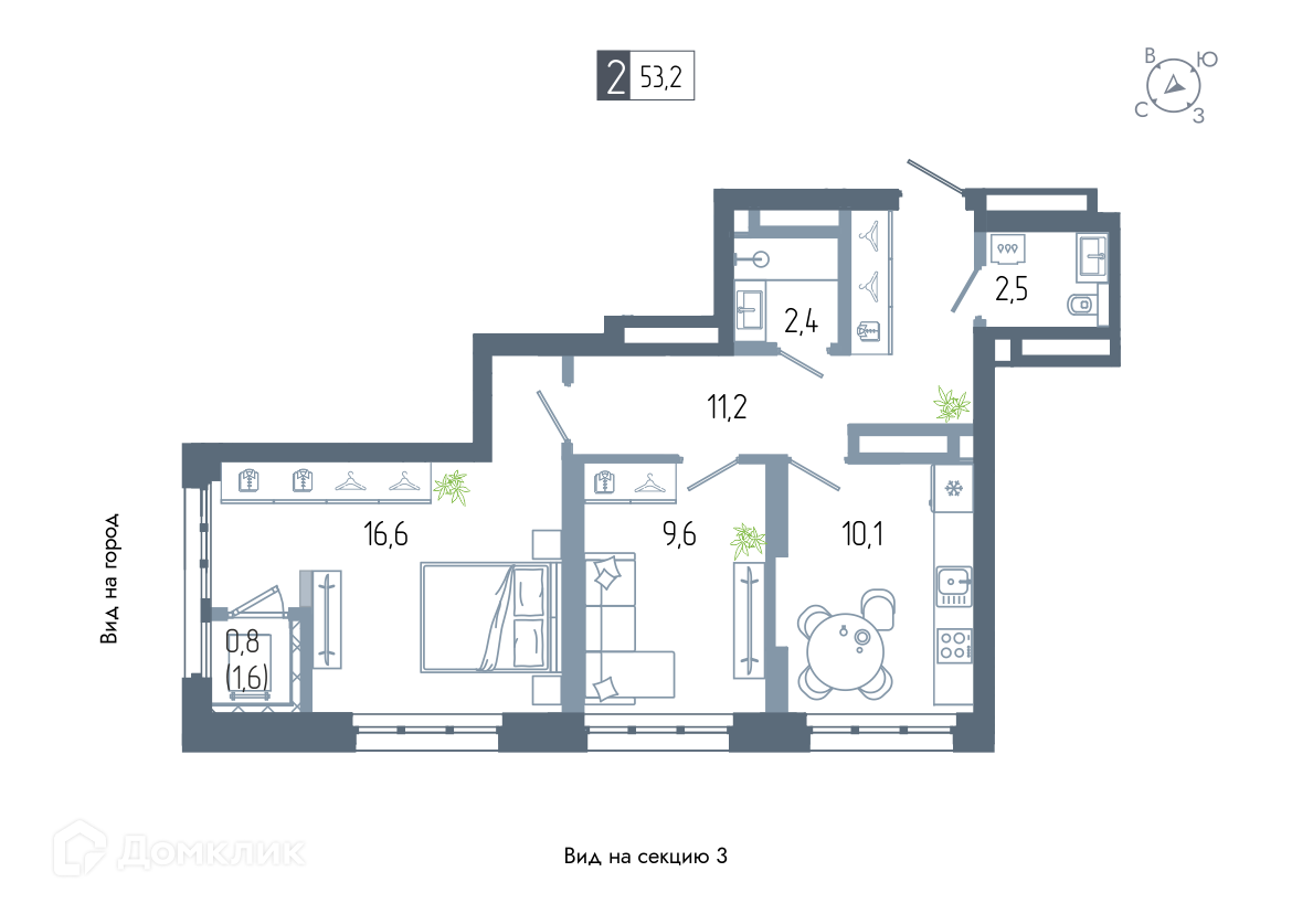 - Общая площадь: 53.2 м²