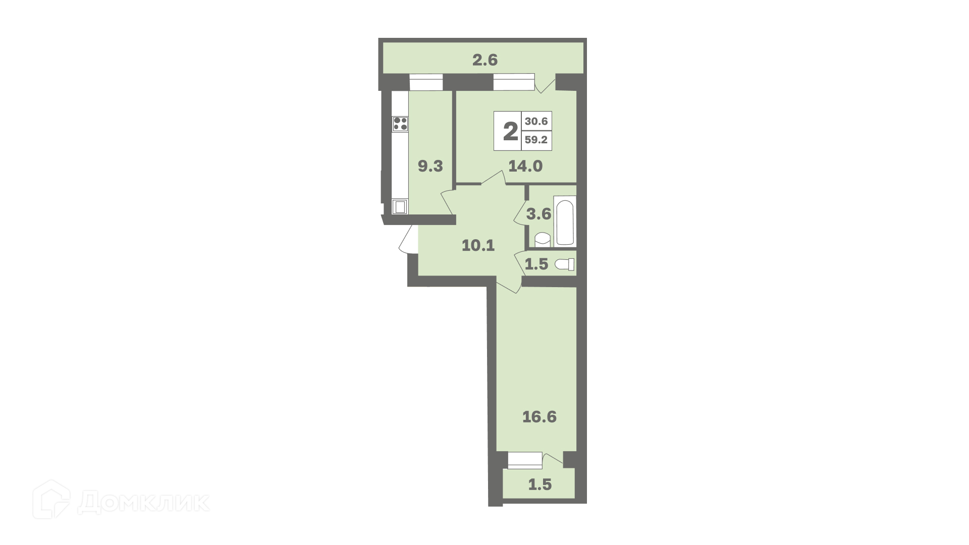 - Общая площадь: 59.2 м²