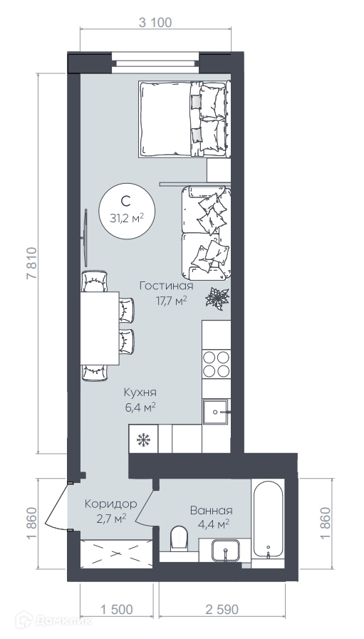 - ✅ Кухня: 0 м² — место для кулинарных шедевров.