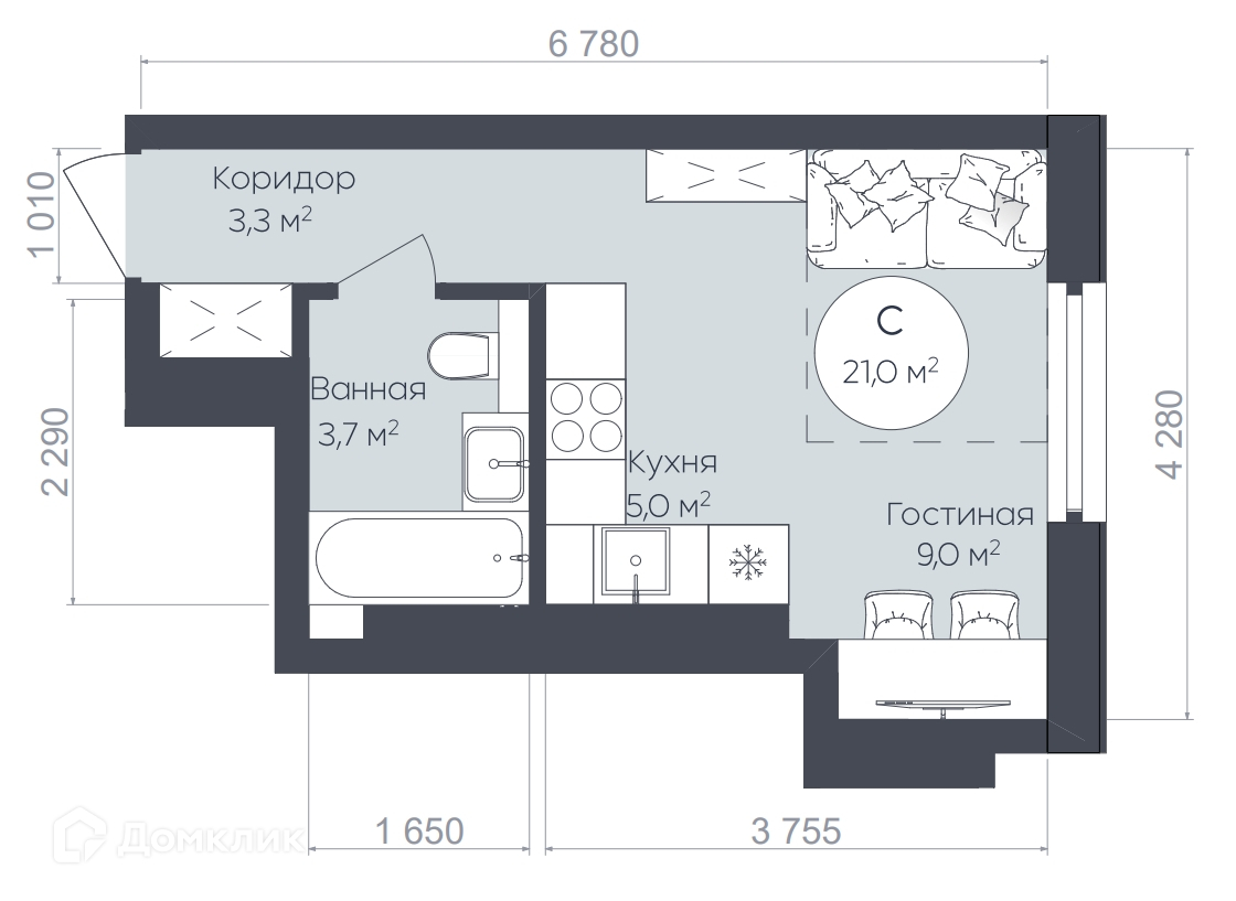 - Общая площадь: 21 м²