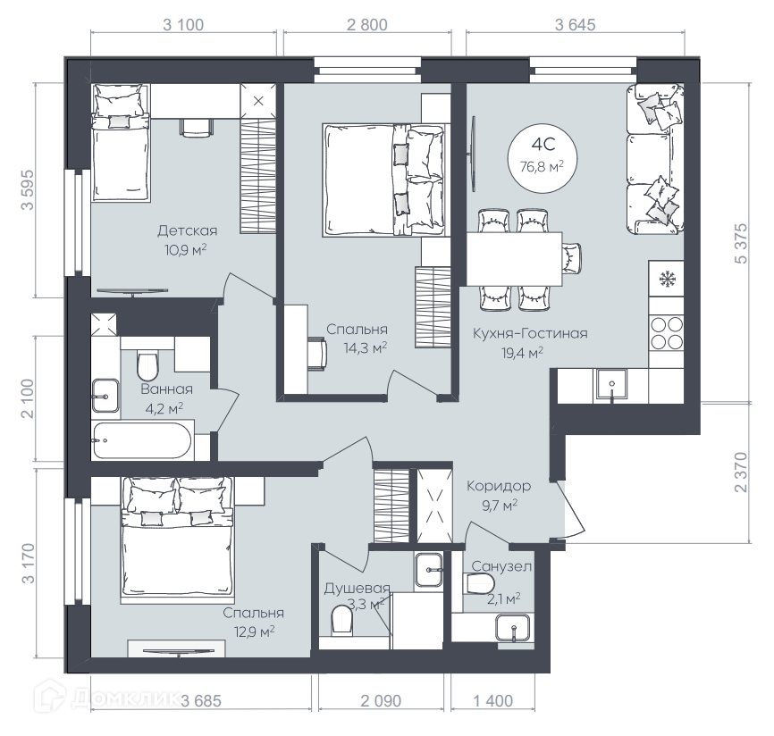 - Общая площадь: 76.8 м²