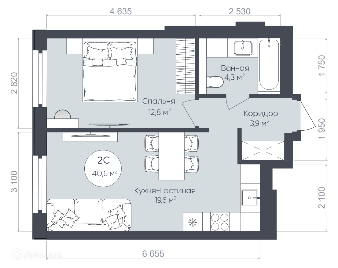 - ✅ Общая площадь: 40.6 м².