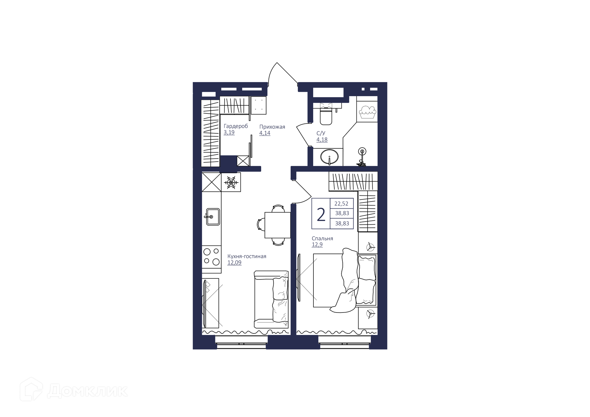 - Общая площадь: 38.83 м²