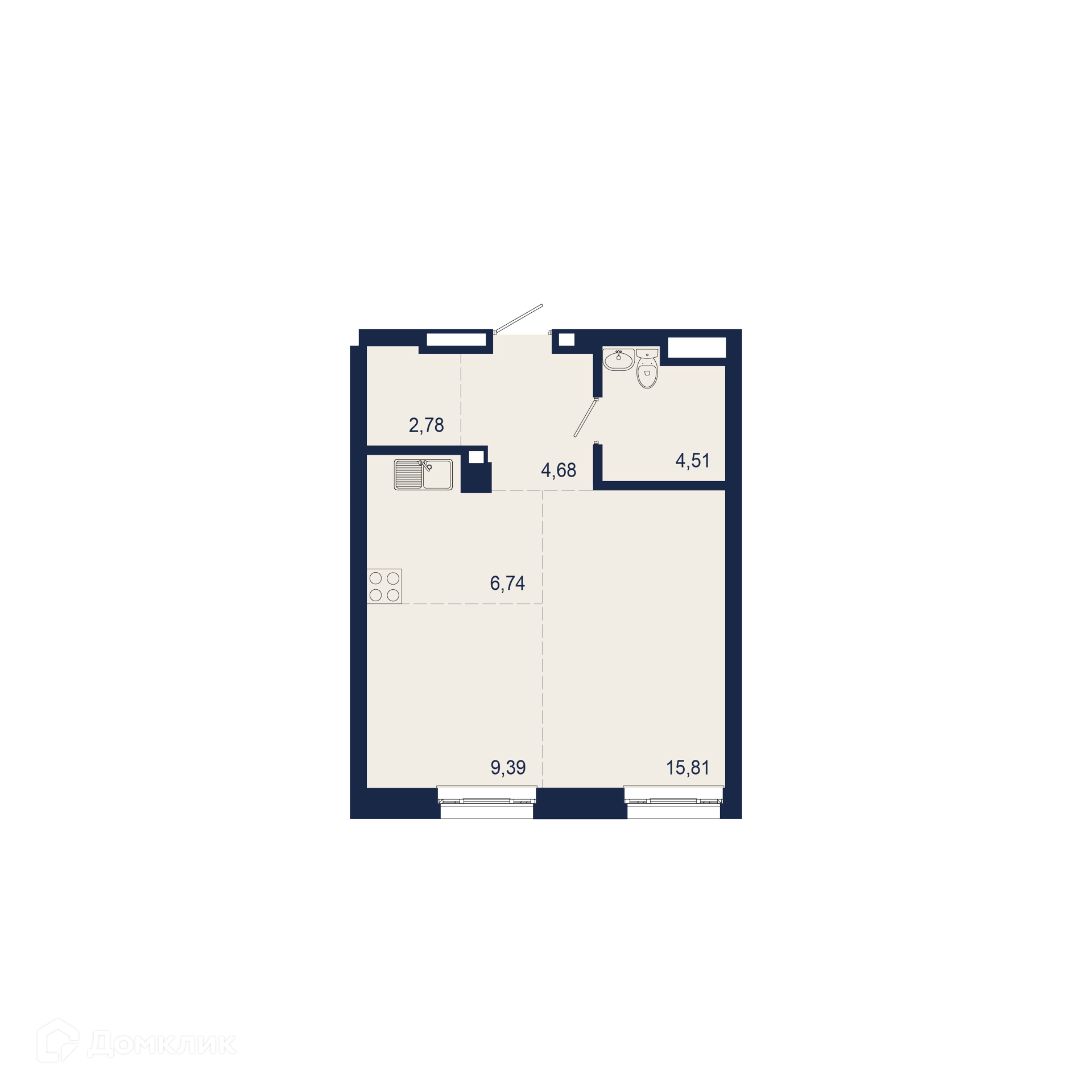 - Общая площадь: 43.91 м²