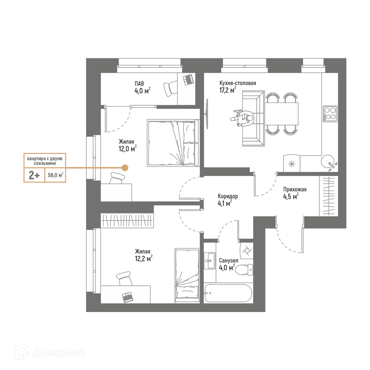 - ✅ Кухня: 17.2 м² — эргономичное пространство.