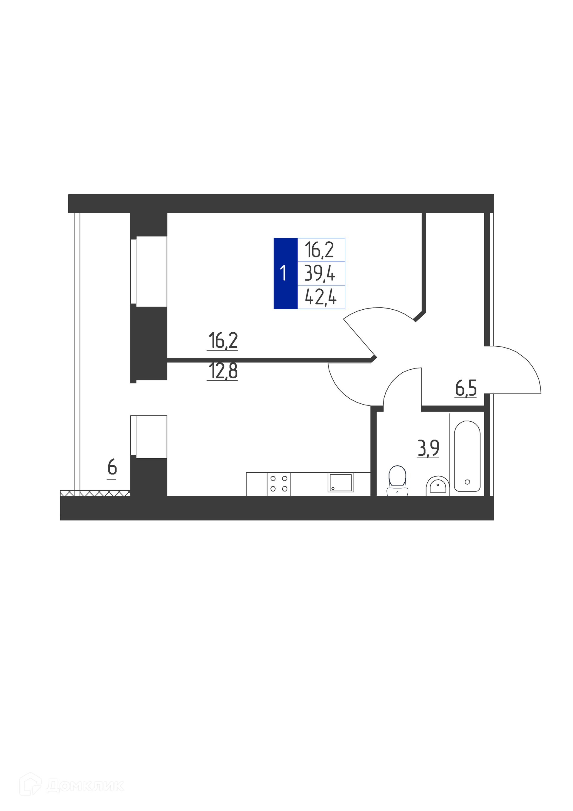 - Общая площадь: 42.4 м²