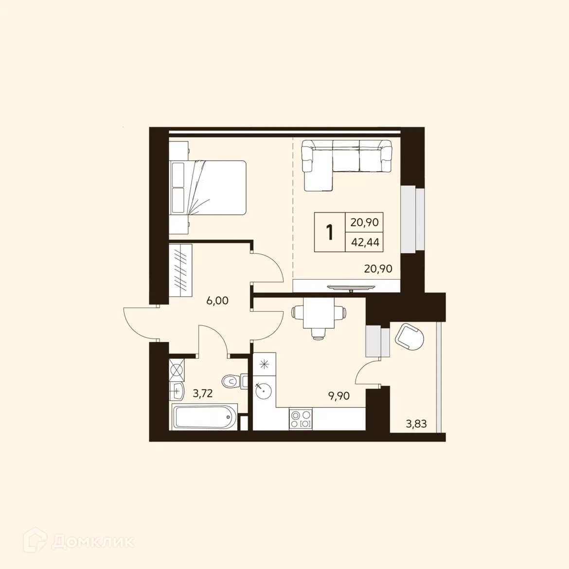 - Общая площадь: 42.44 м²