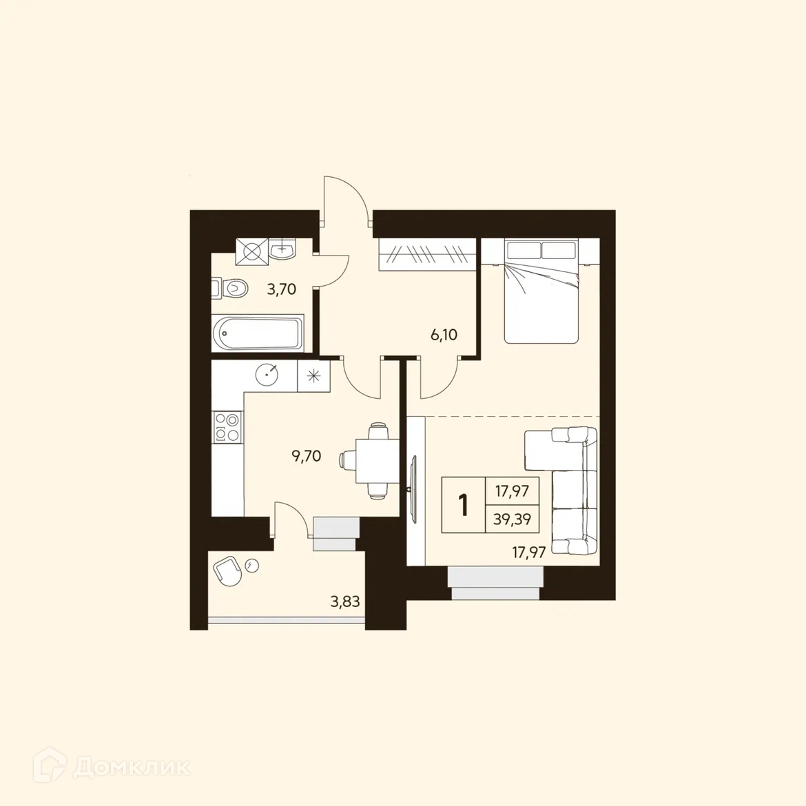 - ✅ Общая площадь: 39.39 м².