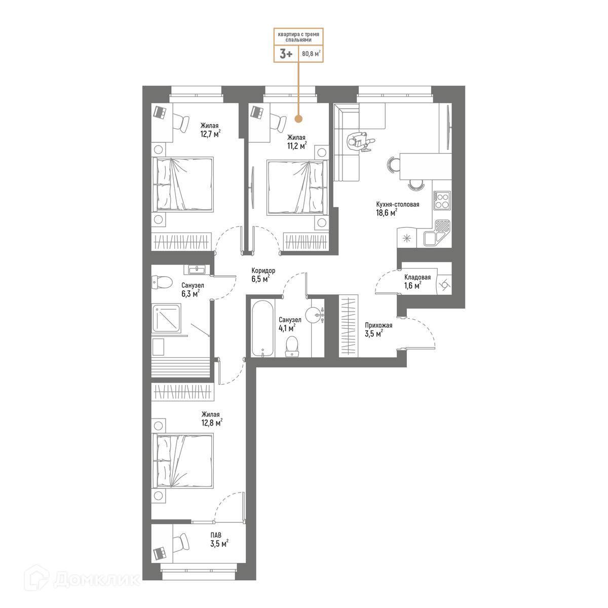 - ✅ Кухня: 18.6 м² — место для кулинарных шедевров.