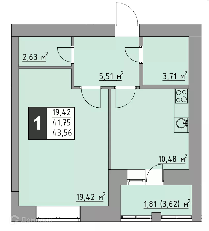 - Общая площадь: 43.56 м²