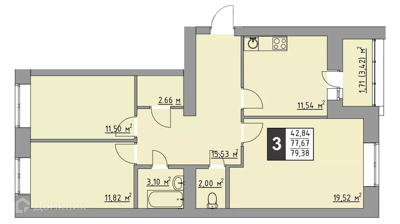 - ✅ Кухня: 11.54 м² — идеальна для семейных ужинов.