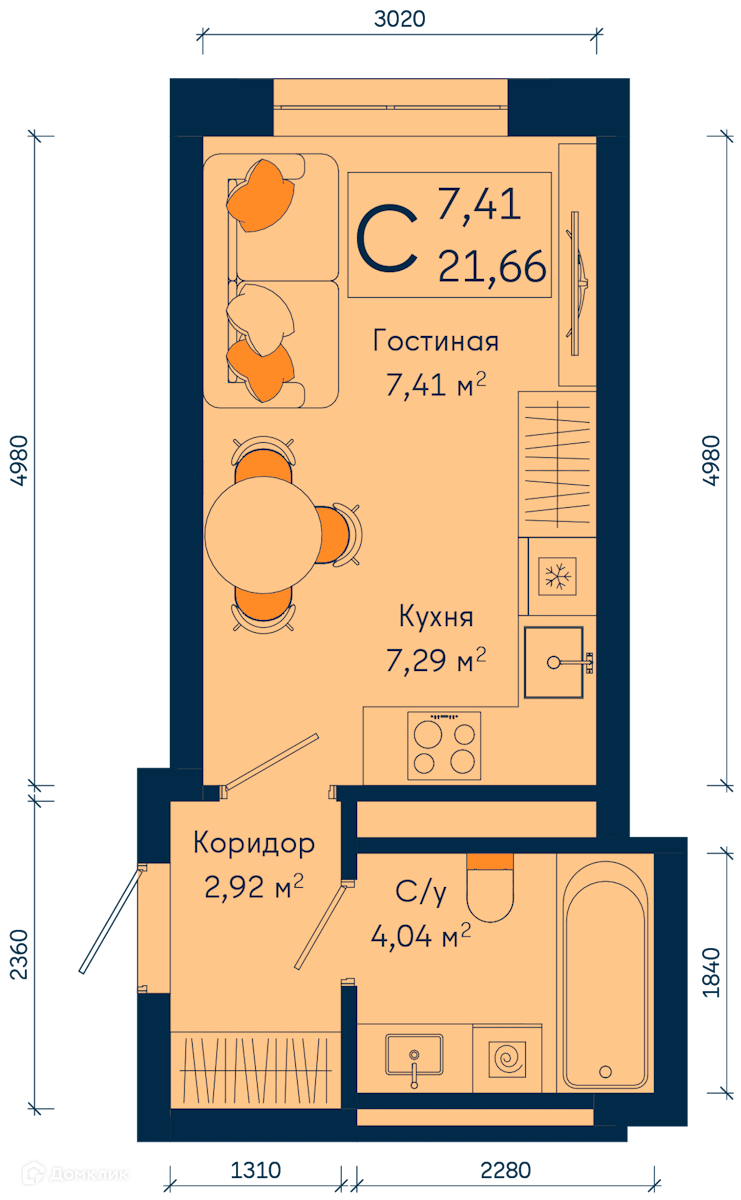 - Общая площадь: 21.66 м²