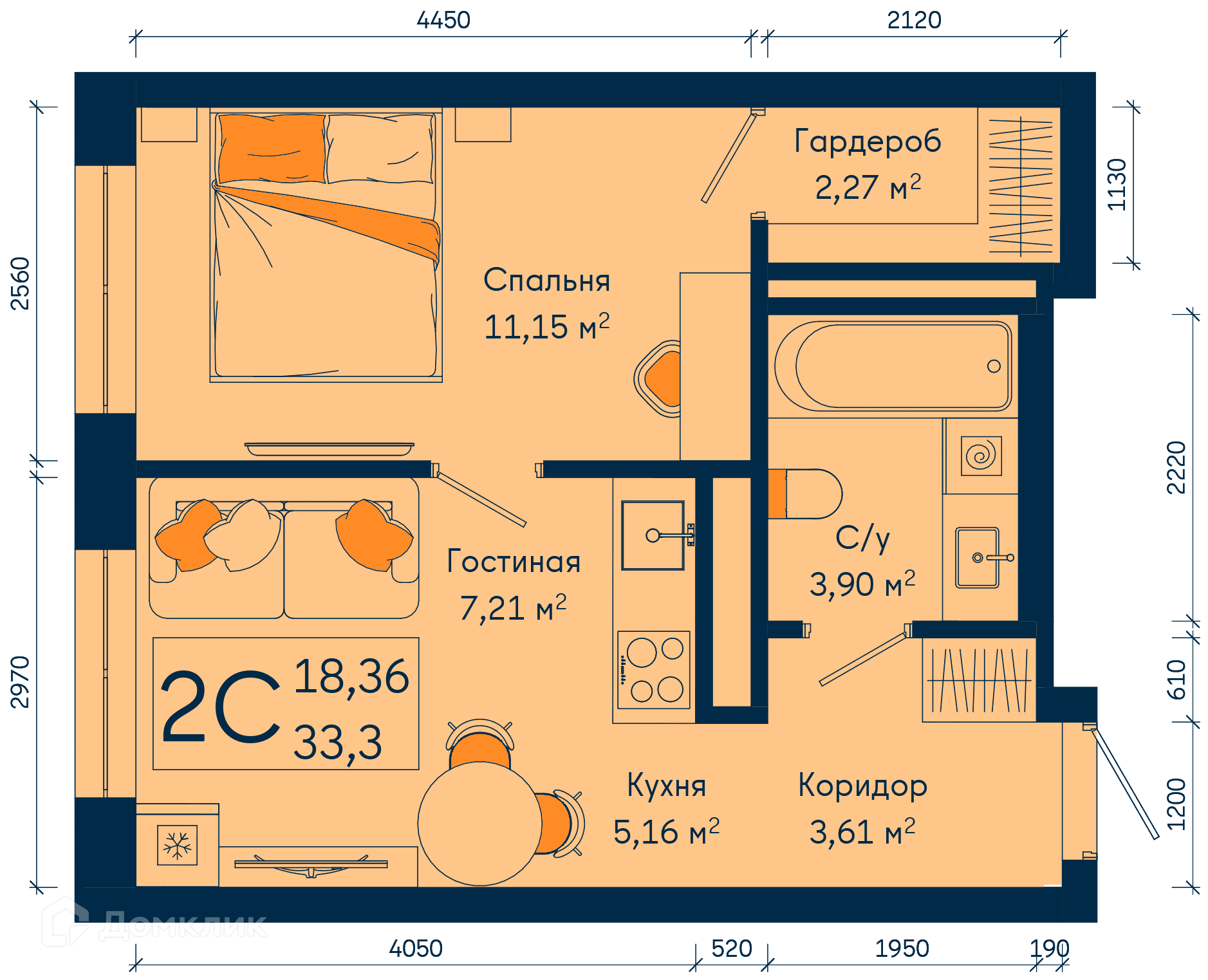 - ✅ Общая площадь: 33.3 м².