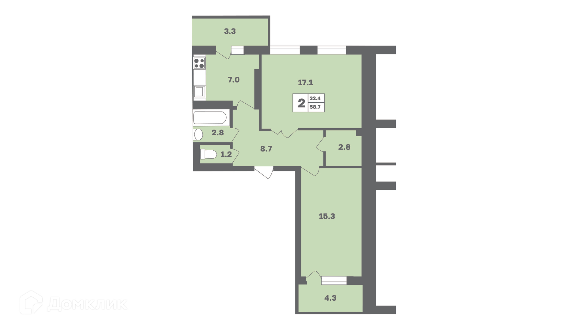 - Общая площадь: 58.7 м²