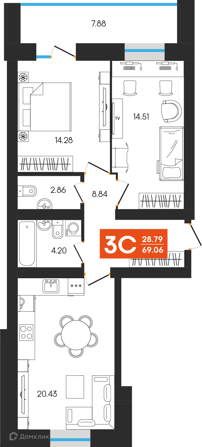 Планировка 3 комн. в ЖК Симфония