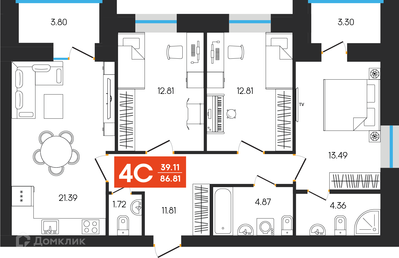 - Общая площадь: 86.81 м²