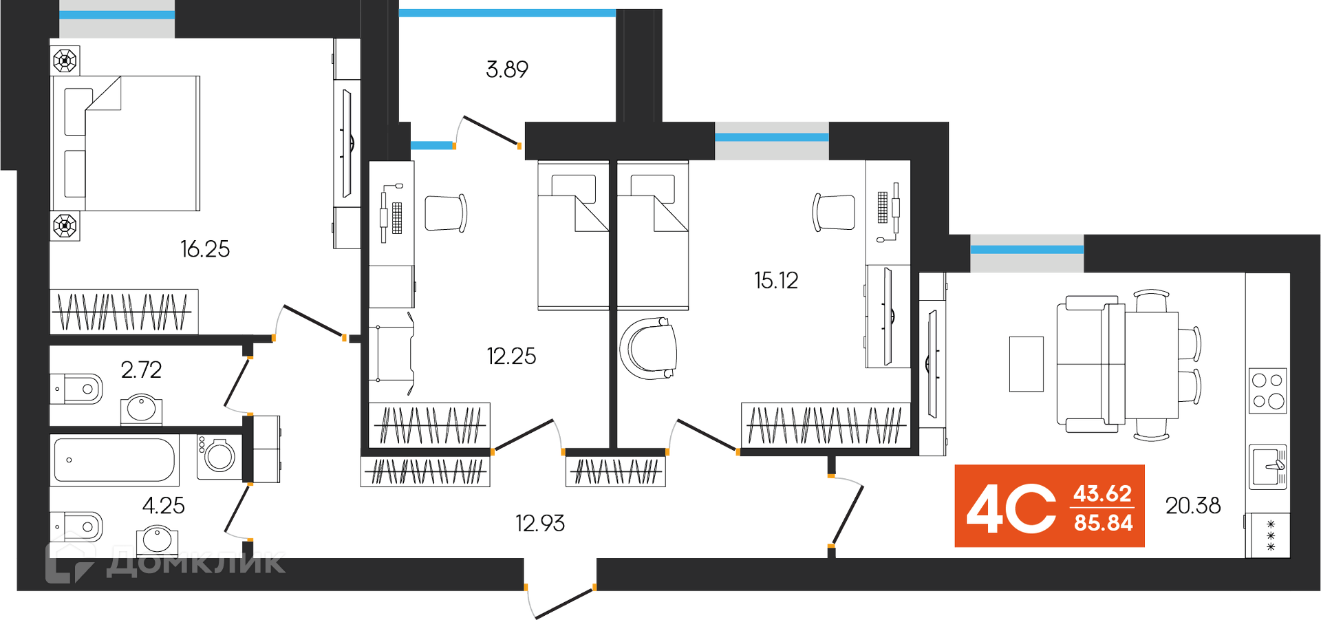 - ✅ Кухня: 20.38 м² — эргономичное пространство.