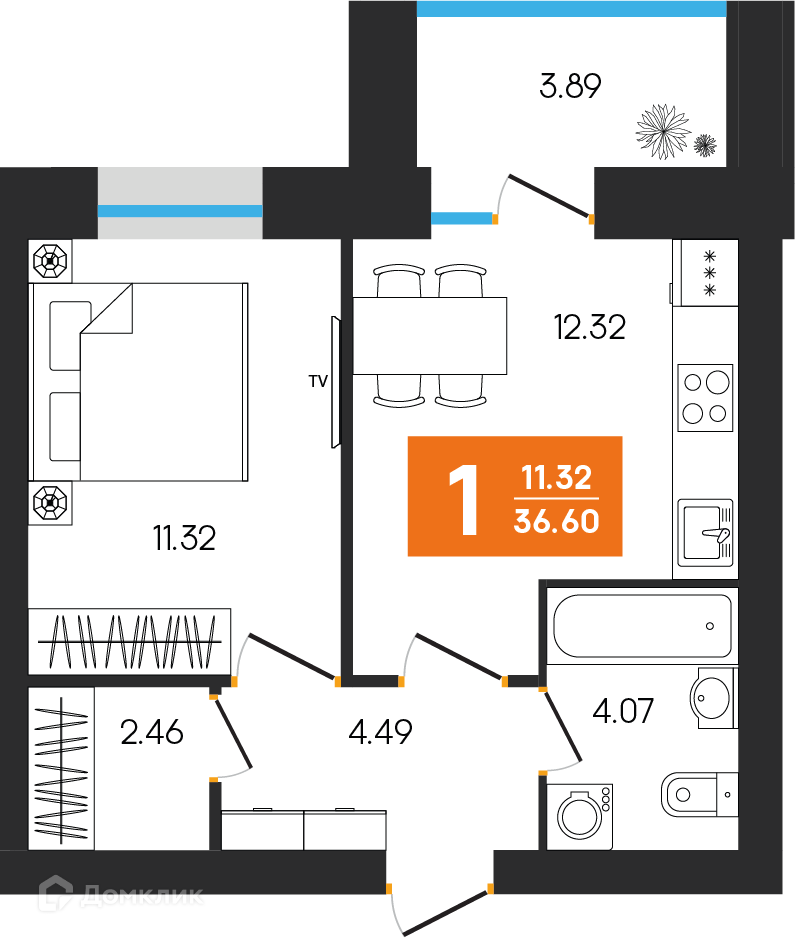 - ✅ Кухня: 12.32 м² — эргономичное пространство.