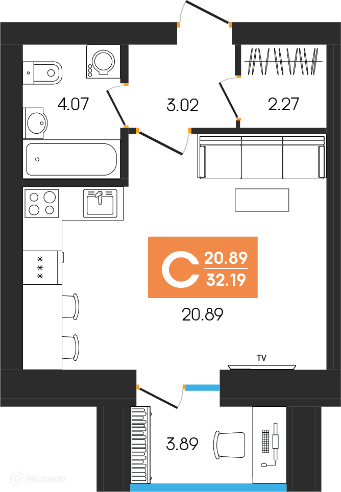 - ✅ Просторная жилая площадь: 20.89 м².