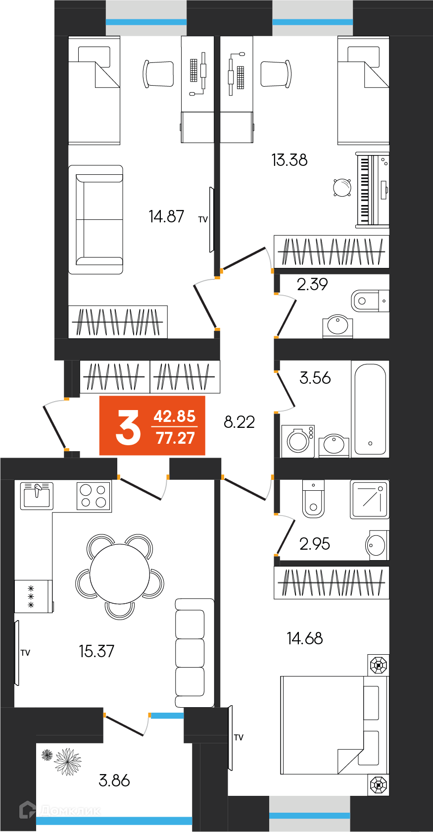 - ✅ Кухня: 15.37 м² — идеальна для семейных ужинов.