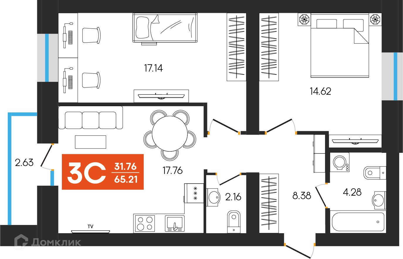 - ✅ Кухня: 17.76 м² — эргономичное пространство.