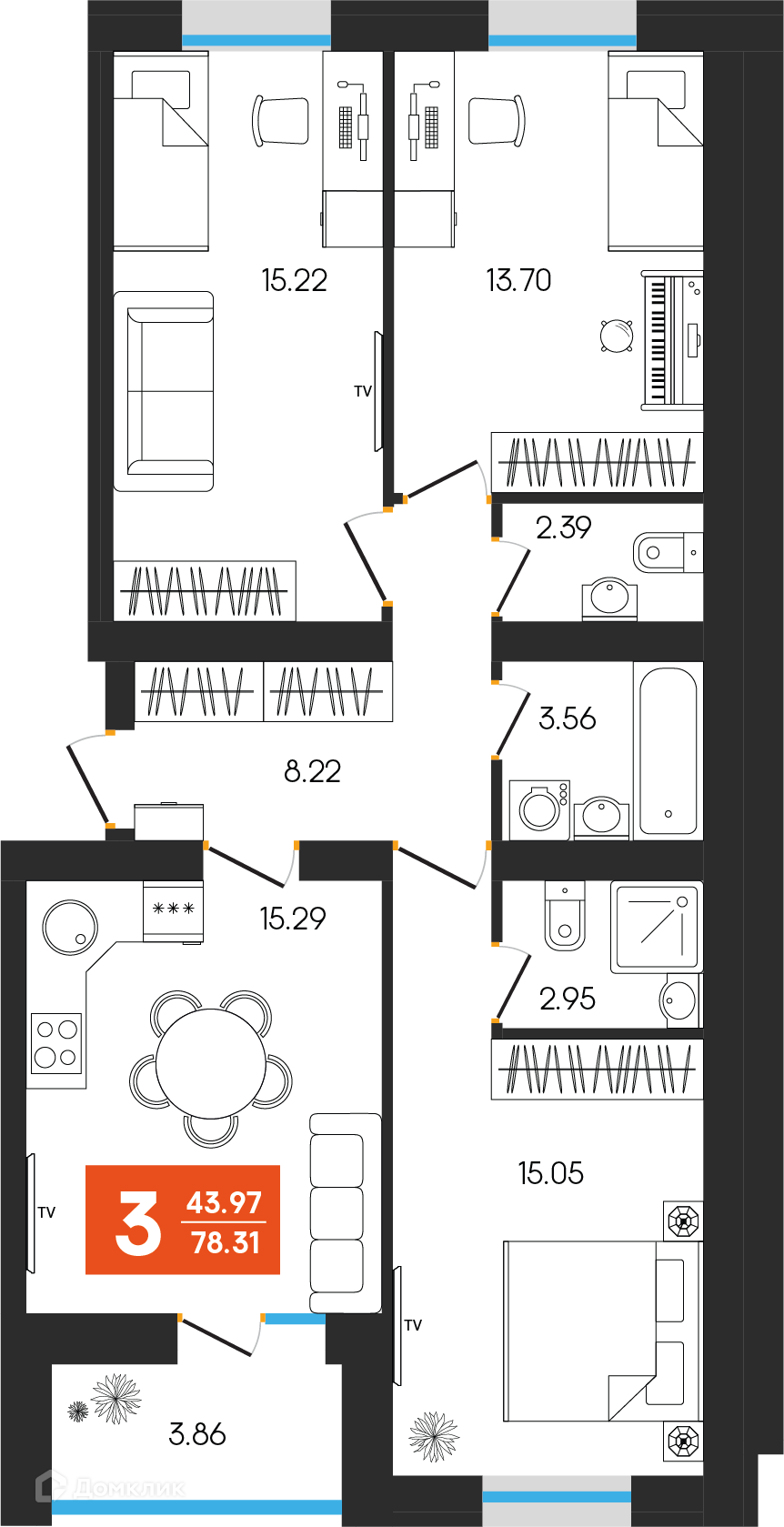 - ✅ Кухня: 15.29 м² — идеальна для семейных ужинов.