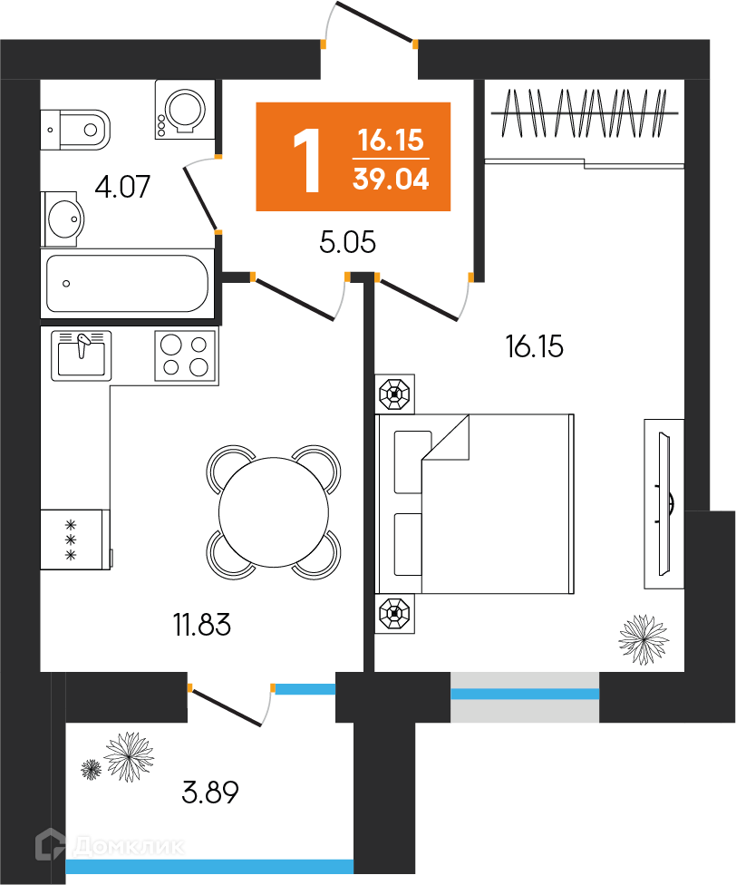 - Общая площадь: 39.04 м²