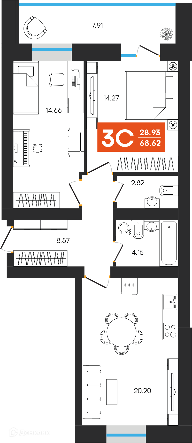 - ✅ Кухня: 20.2 м² — эргономичное пространство.