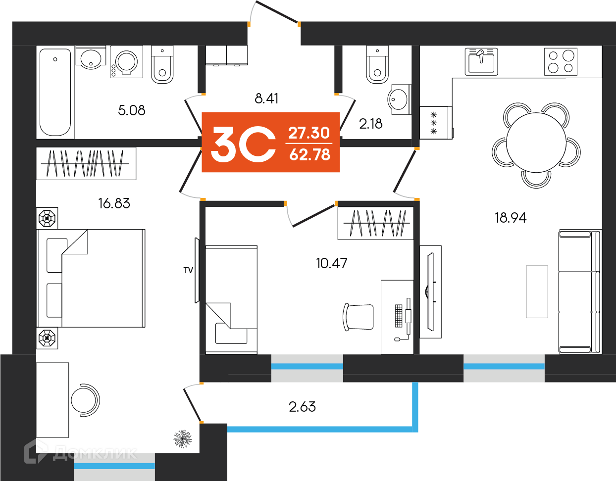 - Общая площадь: 62.78 м²