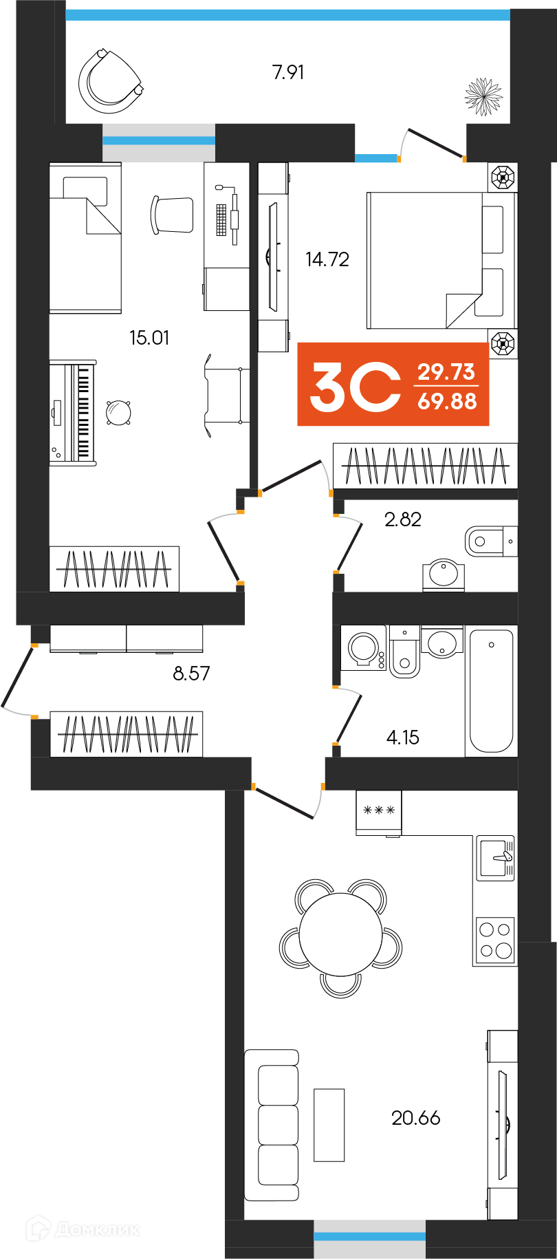 - ✅ Кухня: 20.66 м² — эргономичное пространство.