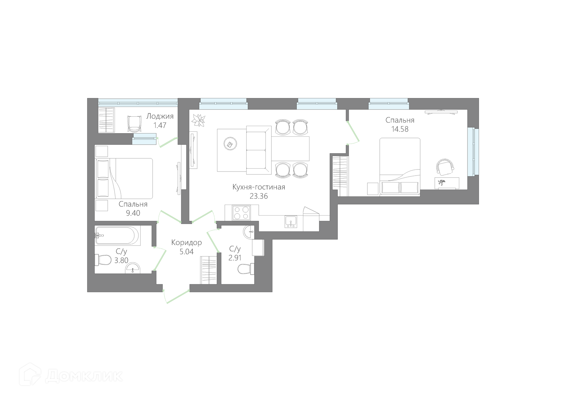 - ✅ Кухня: 23.36 м² — эргономичное пространство.