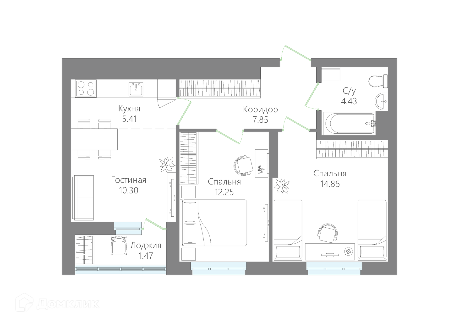 - Общая площадь: 56.57 м²