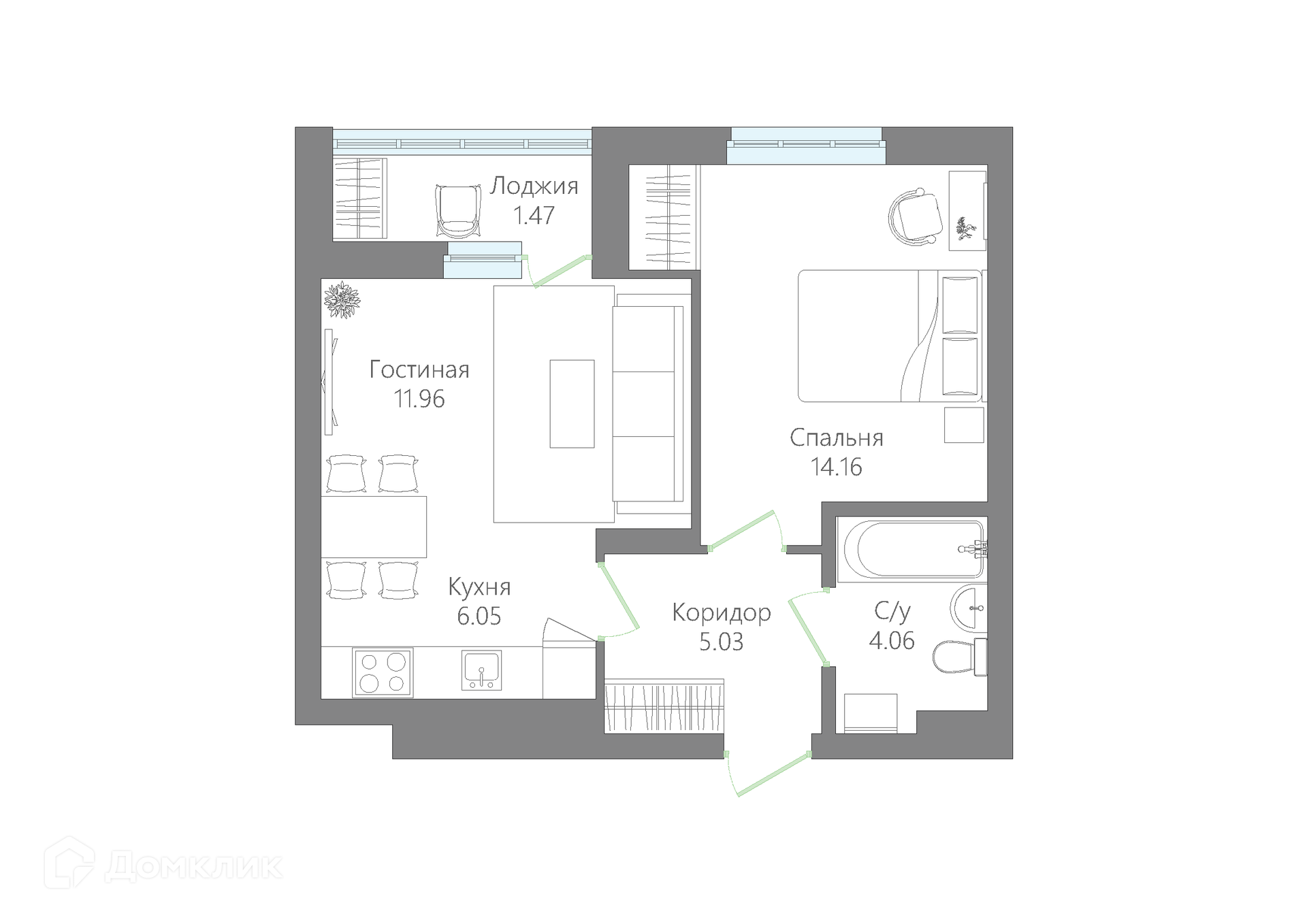 - Жилая площадь: 14.16 м²