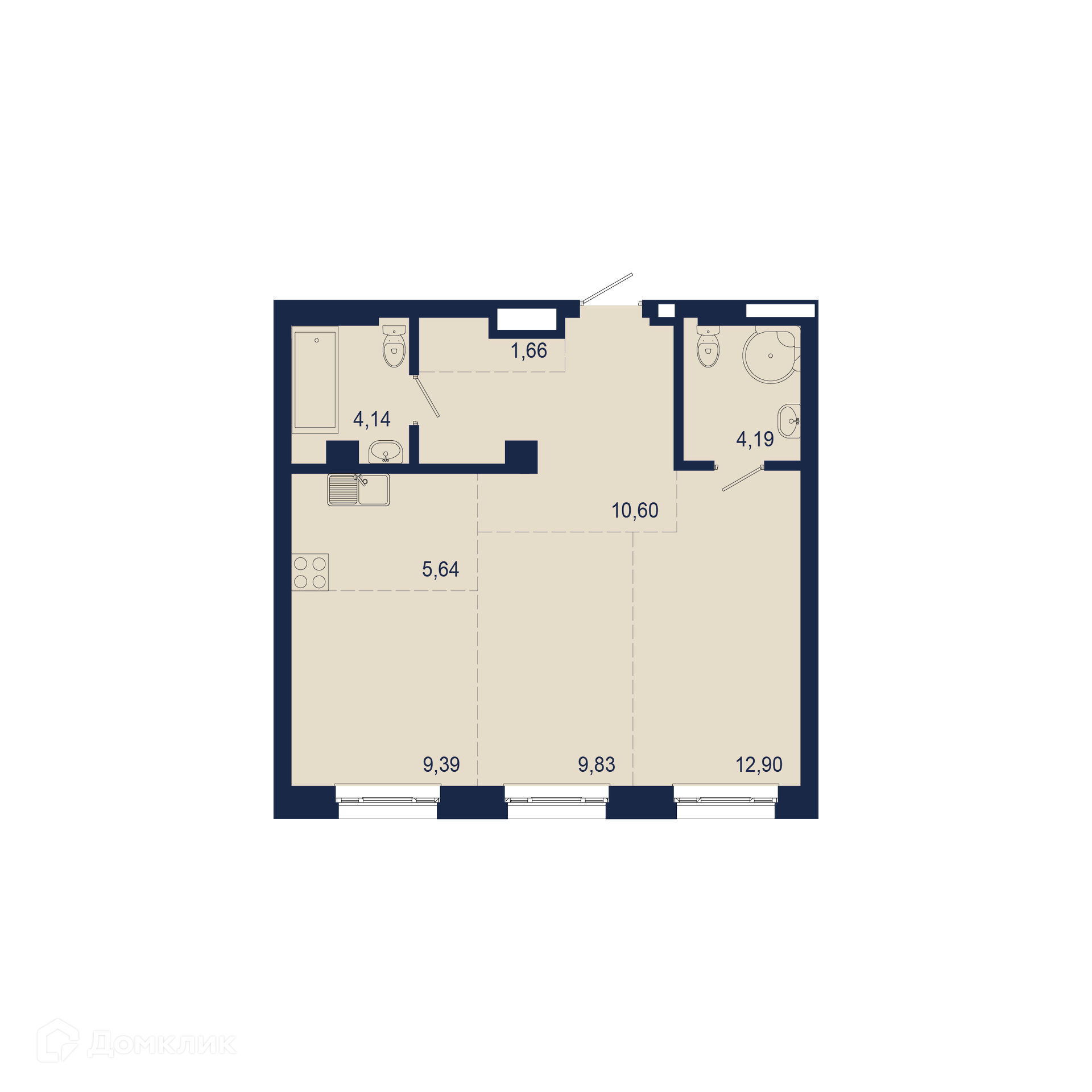 - Общая площадь: 58.35 м²