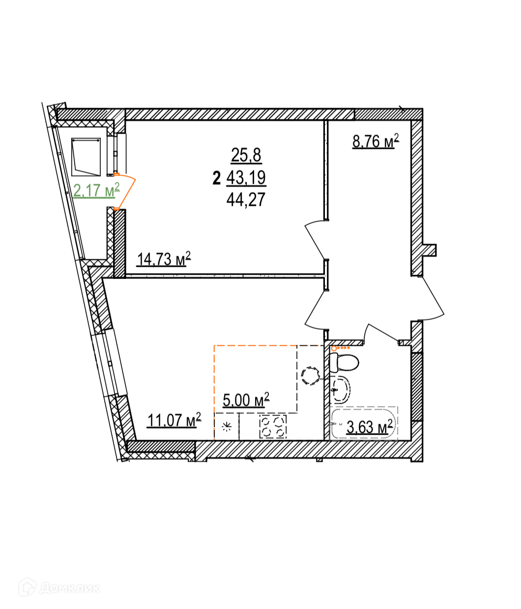 - Общая площадь: 44.27 м²